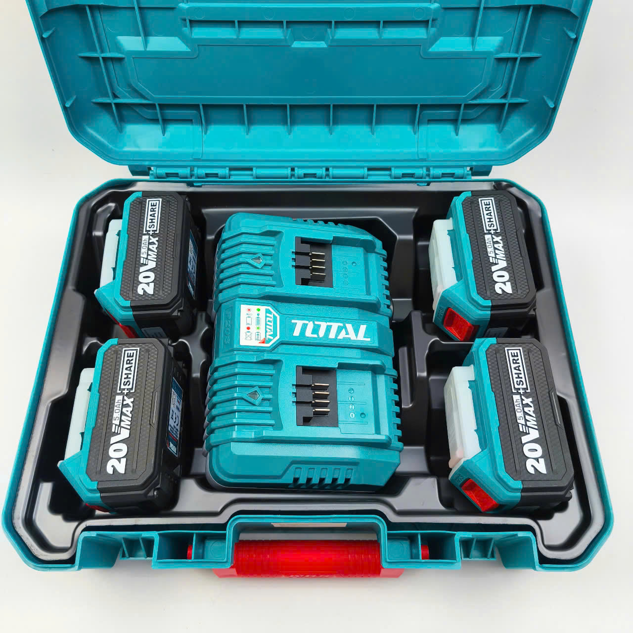 —Bộ nguồn không dây , mạnh mẽ, ổn định cho mọi công việc dung công cụ Pin Total : là giải pháp nguồn dự phòng chuyên nghiệp cho thợ, đội thi công và cửa hàng cho thuê dụng cụ. Mỗi viên pin 20V/4.0Ah (10 cell) cung cấp thời gian hoạt động dài hơn so với pin nhỏ, giúp giảm thiểu gián đoạn công việc. Bộ đi kèm sạc đôi TFBLI2002 (nguồn vào 220–240V~50/60Hz, 2 cổng sạc nhanh) cùng hộp nhựa bảo quản gọn gàng — lý tưởng để trang bị cho xe dịch vụ, tủ dụng cụ tại công trường hoặc workshop.