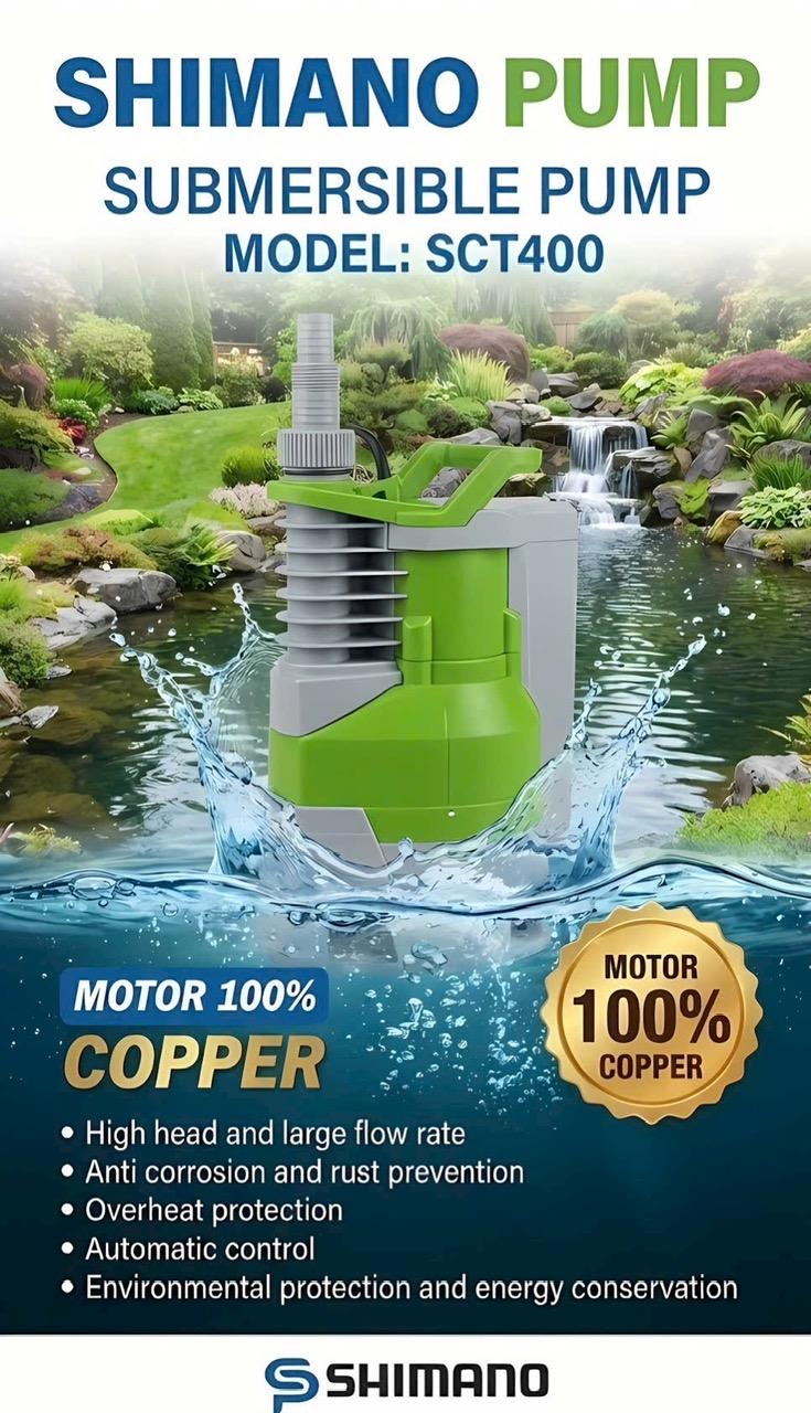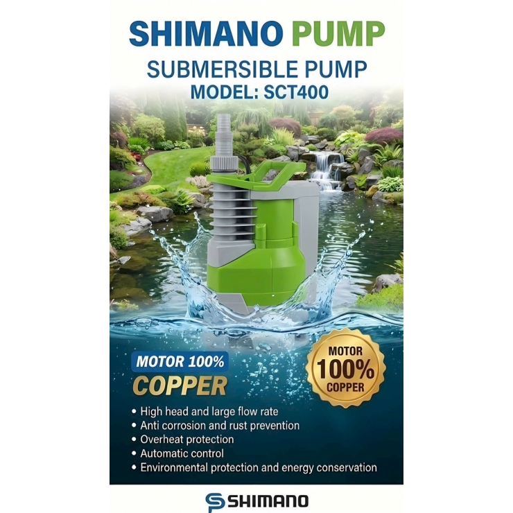 Shimano SCT400: động cơ dây đồng 100%, lưu lượng 8.5 m³/h, đẩy cao 5 m, cánh nhựa – trục Inox, bảo hành 6 tháng. Hoàn hảo cho gia dụng, bể cá, hồ cảnh. Mua ngay tại duc7hienstore.com – Hotline 0982408409/0908416656.