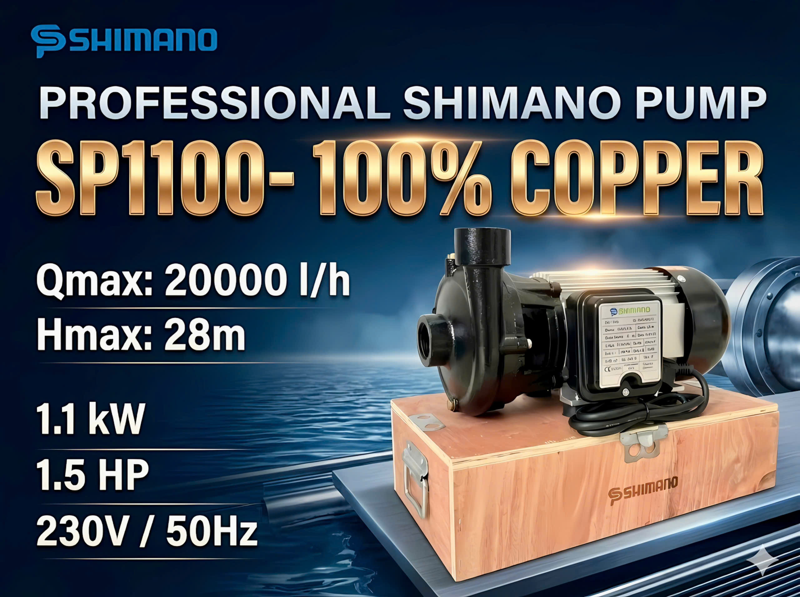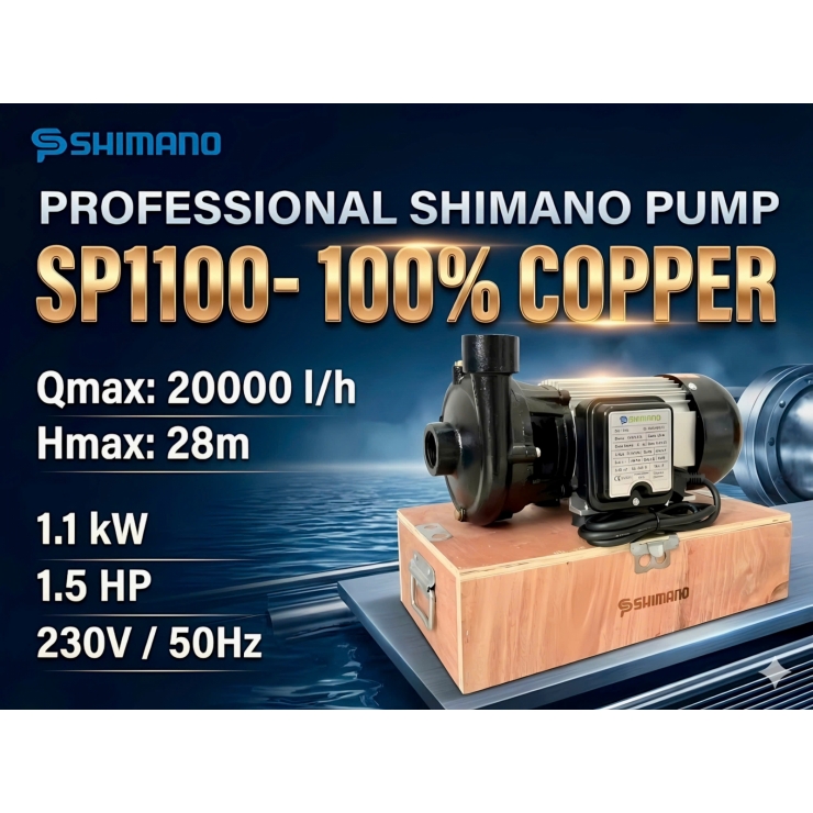 _Bơm nước đẩy cao SHIMANO SP1100 (1.1kW, 1 pha 220V) — giải pháp mạnh mẽ cho cấp nước công trình và tưới tiêu. Với lưu lượng 20 m³/giờ (~333 l/phút) và khả năng đẩy cao 28 m, SP1100 đáp ứng nhu cầu bơm lên tầng cao và địa hình dốc. Cánh đồng, trục inox 304 và thân nhôm giúp máy bền bỉ, chịu ăn mòn; động cơ 100% dây đồng chạy êm, ít nóng. Chuẩn chống bụi/nước IP54 và bảo hành 12 tháng. Phù hợp cho nhà xưởng, nông nghiệp, công trình và hệ cấp nước dự phòng.