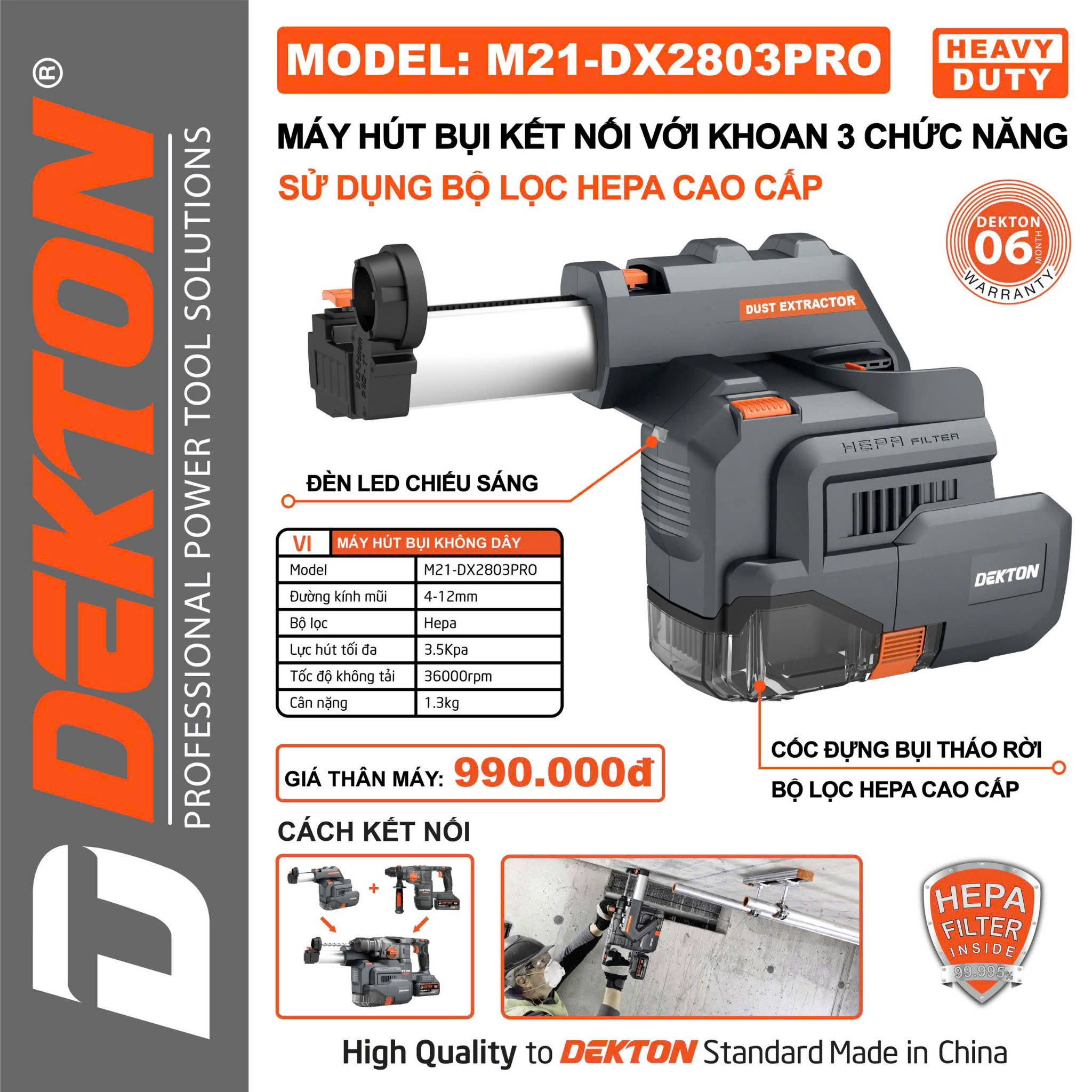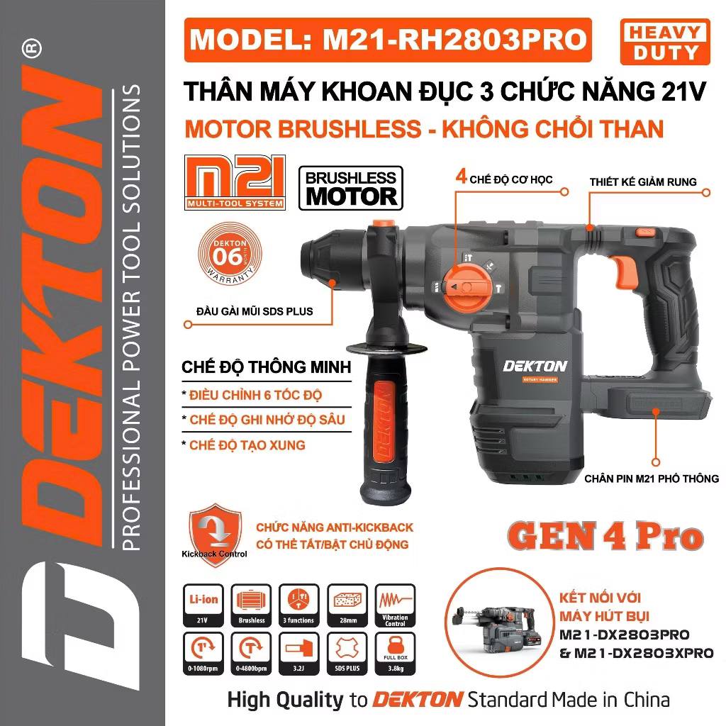 _trang bị động cơ không chổi than (brushless) giúp tăng tuổi thọ, giảm tiêu hao năng lượng và giữ mô-men xoắn tốt ở tải lớn. Nguồn điện 21V tương thích chân pin M21 phổ biến, dễ thay thế và ghép nối với hệ pin cùng hệ. Lực búa 3.2J và tần số va đập lên tới 4800 bpm cho phép khoan lỗ bê tông đến 28mm hiệu quả. Tốc độ không tải 1080 vòng/phút kết hợp chỉnh tốc 6 cấp, ghi nhớ độ sâu và chế độ tạo xung giúp tối ưu thao tác khi gặp vật liệu cứng hoặc cần kiểm soát độ sâu chính xác. Đầu gài mũi SDS-Plus 14mm tương thích rộng rãi, thuận tiện thay mũi nhanh trên công trường. Máy còn có khả năng kết nối với bộ hút bụi chuyên dụng Dekton M21-DX2803PRO, rất hữu ích khi làm việc trong không gian cần giảm bụi.