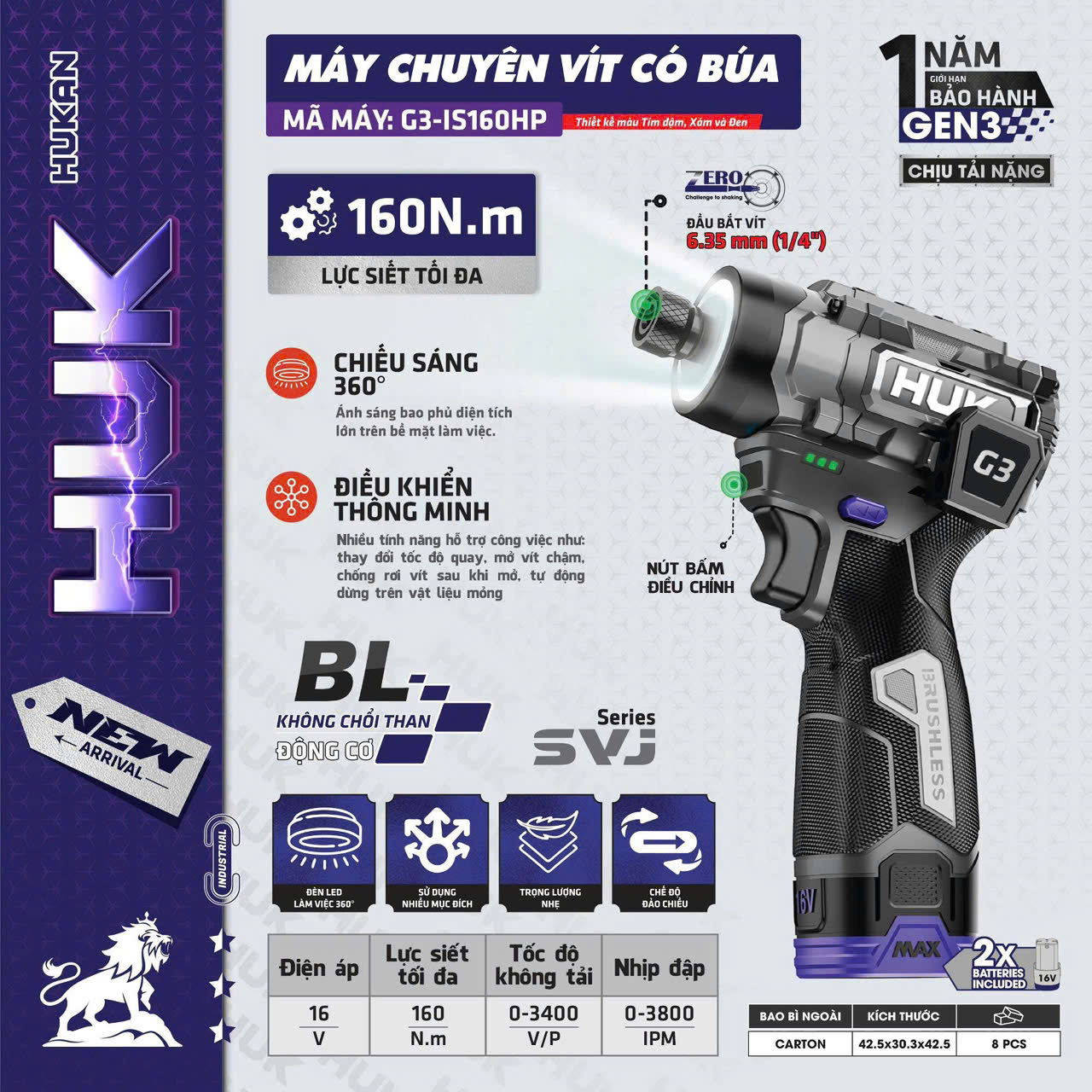 Máy bắn vít búa 16V Hukan G3-IS160HP Brushless ( bộ )