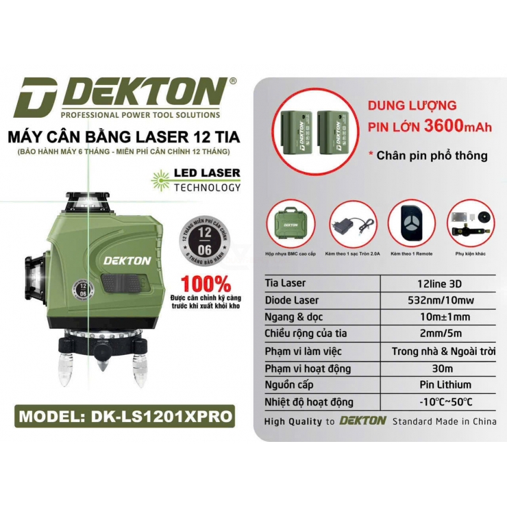 _Nếu bạn đang tìm kiếm máy cân bằng laser 12 tia xanh chất lượng, chính xác, bền bỉ và dễ sử dụng, thì Dekton DK-LS1201XPRO chính là lựa chọn hoàn hảo. Với thiết kế hiện đại, công nghệ laser xanh siêu sáng, độ chính xác ±0.1mm/10m cùng khả năng hoạt động đa năng trong nhiều công trình, sản phẩm này xứng đáng là công cụ đồng hành cho mọi kỹ sư, thợ thi công và người làm nội thất.