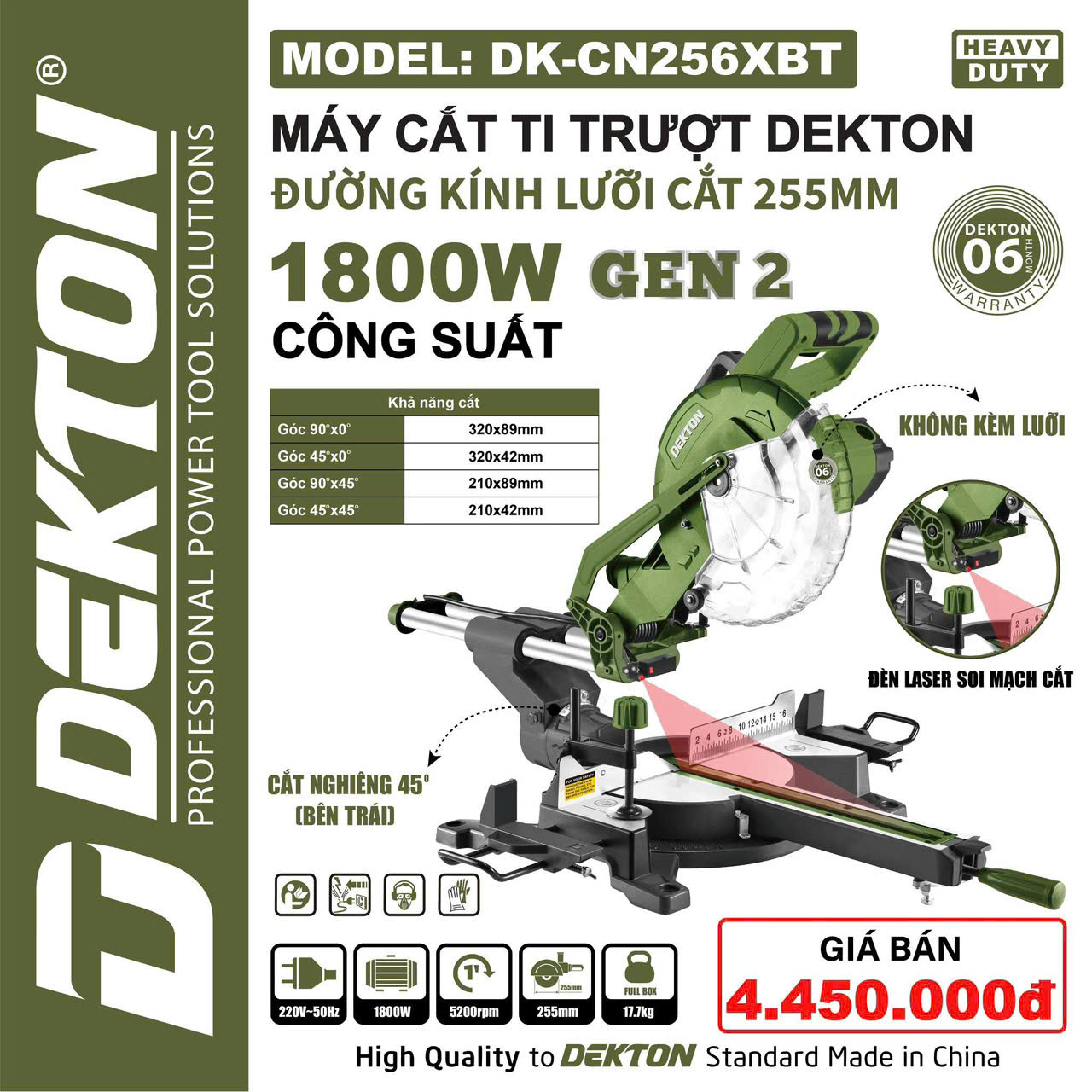 —Dòng máy cắt nhôm & gỗ chuyên dụng 2 ti trượt hành trình dài , laser rọi mặt cắt, motor dây đồng 1.800W : là giải pháp cho xưởng nhôm kính, xưởng mộc và cơ sở gia công nội thất cần thiết bị cắt chính xác, bền bỉ và vận hành ổn định. Máy tích hợp motor 100% dây đồng 1.800W chạy ở 5.200 rpm, dùng lưỡi 255 mm, truyền tải trực tiếp, trang bị 2 ti trượt (30 mm) hành trình dài để đảm bảo độ thẳng và ổn định khi cắt các thanh nhôm, nẹp hoặc ván gỗ dài. Laser rọi mặt cắt hỗ trợ căn chỉnh nhanh và chính xác trước khi thao tác; cơ cấu nghiêng đầu (45° trái) và xoay bàn (±45° trái/phải) cho phép thực hiện các đường cắt miter phức tạp & đa dạng yêu cầu.