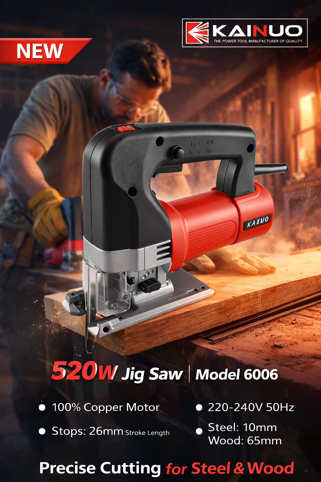 — Giải pháp cắt gỗ và kim loại chính xác, mạnh mẽ và bền bỉ :  là lựa chọn tối ưu cho công việc cắt cong, cắt chi tiết và cắt theo đường zic-zac trên gỗ, kim loại mỏng và nhựa. Với công suất 520W, điện áp 220–240V 50Hz và tốc độ không tải điều chỉnh 500–2800 lần/phút, Kainuo 6006 kết hợp sức mạnh và kiểm soát, cho đường cắt mượt mà và ít cháy cạnh. Động cơ 100% dây đồng đảm bảo độ bền cao và hoạt động ổn định; độ sọc 26mm giúp thực hiện đường cắt sâu tới 65mm trên gỗ và cắt thép mạ hoặc thép tấm dày tới 10mm. Sản phẩm đi kèm chính sách bảo hành 6 tháng, phù hợp cho thợ mộc, thợ cơ khí và người làm DIY chuyên nghiệp.