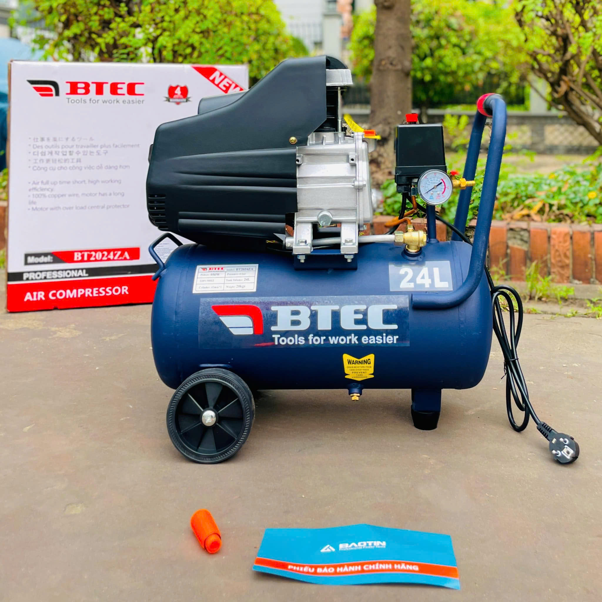 _là lựa chọn thiết thực cho gara, xưởng mộc, thợ sơn và các xưởng sản xuất nhỏ cần nguồn khí nén ổn định, di động và bền bỉ. Thiết bị kết hợp motor 100% dây đồng, bình chứa 24 lít, áp suất làm việc 8 bar và thời gian nạp nhanh (tham chiếu: ~1 phút 45 giây với xi lanh 42 mm) — đáp ứng tốt cho súng phun sơn, súng bắn đinh, súng thổi và các công cụ khí nén cỡ nhỏ đến trung bình. Là loại nén khí chạy dầu (oil-lubricated), BT2024ZA có đặc tính vận hành êm, độ bền cao và thích hợp cho công việc chuyên nghiệp.