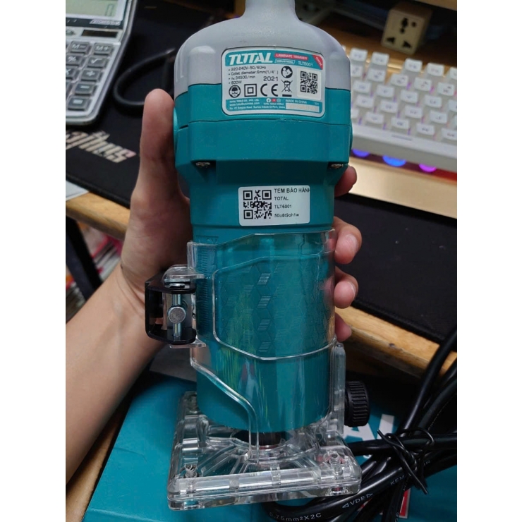 _Total TLT6001 là máy phay alu 6mm thiết kế cho cả gỗ và hợp kim nhôm mỏng; motor 100% dây đồng 600W kết hợp tốc độ không tải lên đến 34.500 rpm cho hiệu năng cắt mượt mà. Máy hỗ trợ collet 6.0mm và 1/4" (6.35mm), đi kèm mũi phay chuẩn, đóng gói trong hộp carton và được bảo hành 6 tháng — tiện dùng cho SOI MỘNG GỖ, phay rãnh, vát mép và gia công chi tiết nhôm nhỏ.