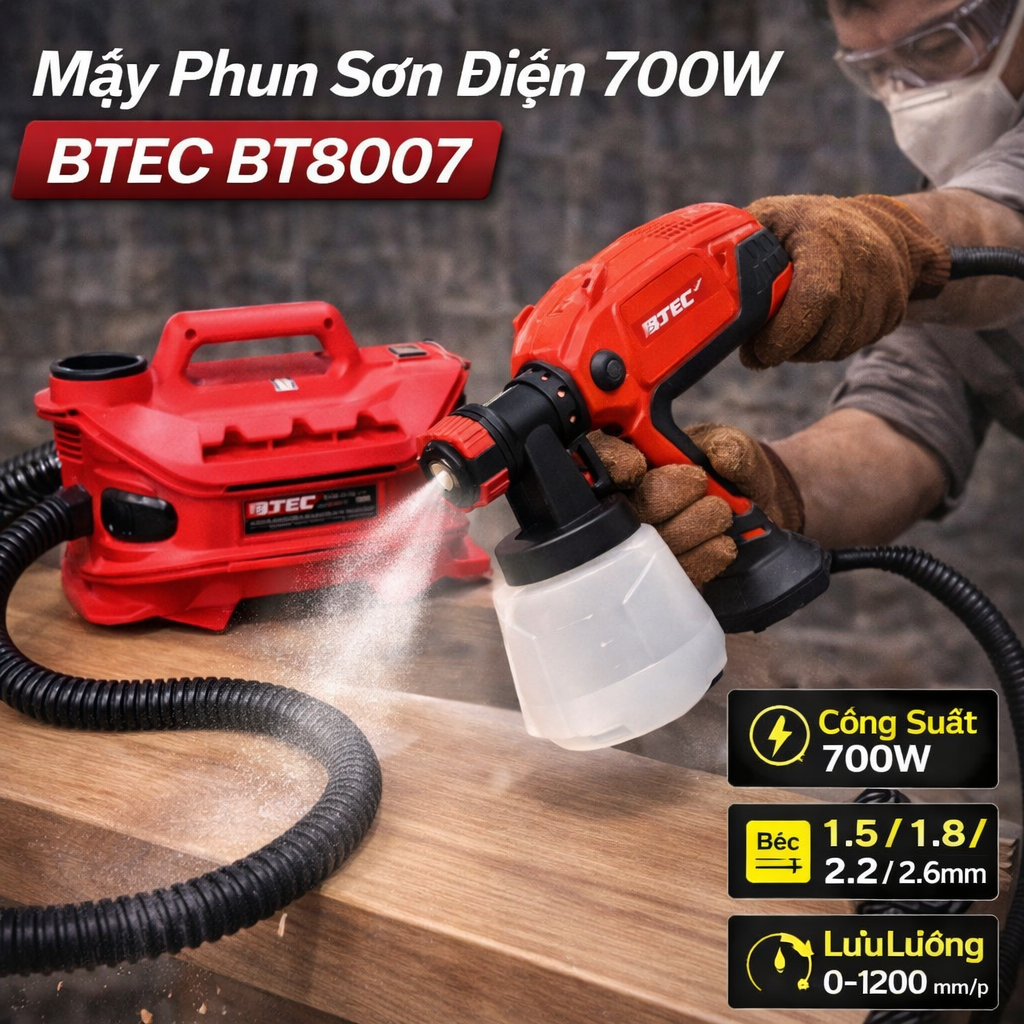 Btec BT8007 phù hợp cho cả phun phần diện tích lớn (tấm, cửa, cánh tủ) và phun chi tiết (viền, khe, góc). So với phương pháp phun truyền thống, máy giúp rút ngắn thời gian thi công, giảm hao hụt sơn và tạo bề mặt mịn, đều màu — phù hợp với yêu cầu thẩm mỹ cao của nội thất hiện đại và sơn sửa phương tiện.