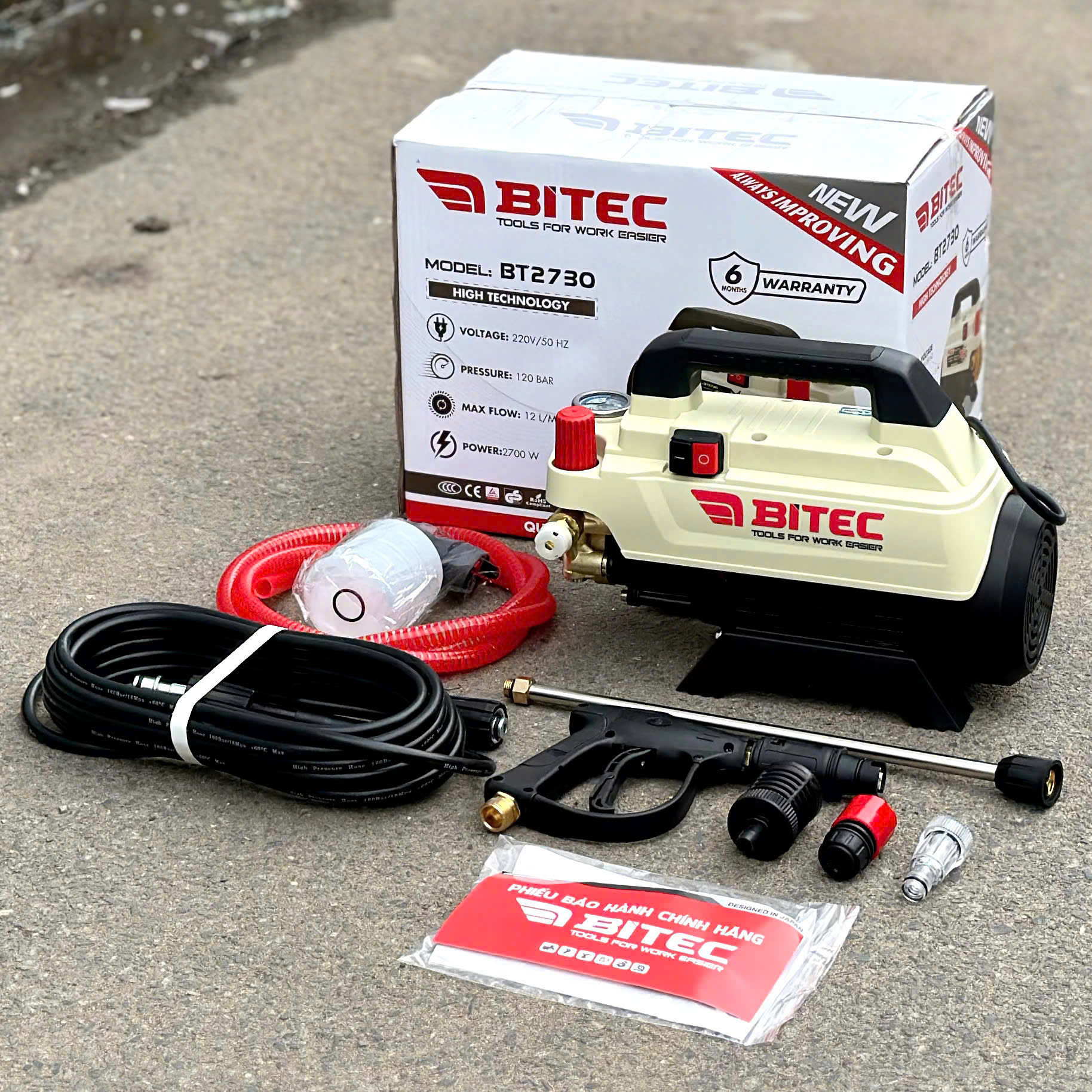 là giải pháp xịt rửa áp lực xách tay hiệu quả, kết hợp sức mạnh làm sạch với tính năng chỉnh áp linh hoạt. Thiết kế chuyên dụng cho nhu cầu rửa xe ô tô, xe máy, vệ sinh sân vườn và các công việc làm sạch công nghiệp nhẹ. Với công suất 2.700W, áp lực tối đa 120 Bar và lưu lượng 14 L/phút, BT2730 mang lại sự cân bằng giữa áp lực mạnh để tẩy vết bẩn cứng đầu và lưu lượng đủ để rửa nhanh trên diện rộng. Motor 100% dây đồng cùng dây nguồn chống giật đảm bảo hoạt động bền bỉ và an toàn cho người sử dụng. Máy được đóng gói cùng phụ kiện tiêu chuẩn (dây áp 10m, dây hút 2m, súng kèm khớp nối, bình bọt, lọc rác), thuận tiện dùng ngay sau khi mở hộp. Sản phẩm hưởng chế độ bảo hành 6 tháng từ nhà sản xuất.