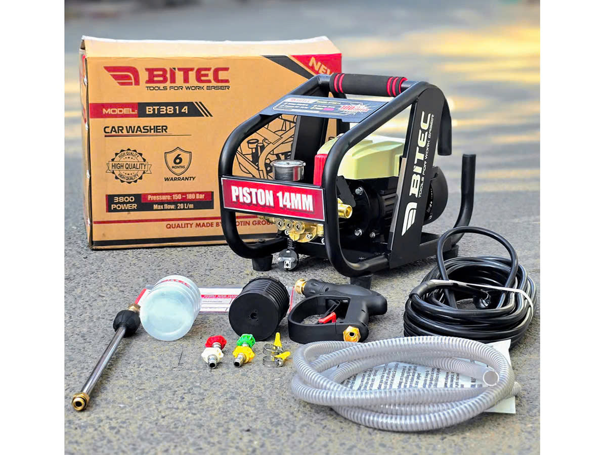 _ là lựa chọn tối ưu khi bạn cần hiệu năng làm sạch cao, vận hành an toàn và bền bỉ. Với pittong 14mm và motor dây đồng, BT3814 xử lý tốt áp lực cao liên tục, trong khi chức năng chỉnh áp cho phép chuyển đổi giữa các nhiệm vụ: áp cao cho vết bẩn cứng đầu, áp thấp cho rửa sơn, nội thất hay bề mặt nhạy cảm. Khung sắt bảo vệ và dây áp dài 15m giúp thao tác thoải mái, di chuyển thuận tiện trên mặt bằng rộng. Bộ phụ kiện đi kèm hỗ trợ công việc ngay sau khi lắp đặt.