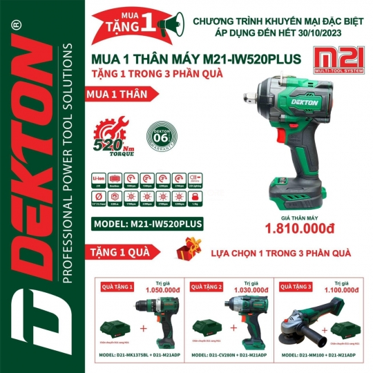 Khi Mua Thân Máy Bulong Pin Dekton 520Nm + Chọn quà tặng ( giá trị ) 1 trong 3 Sản Phẩm hệ sinh thái D21 ( kèm chân chuyển Pin D21 sang chân M21 )