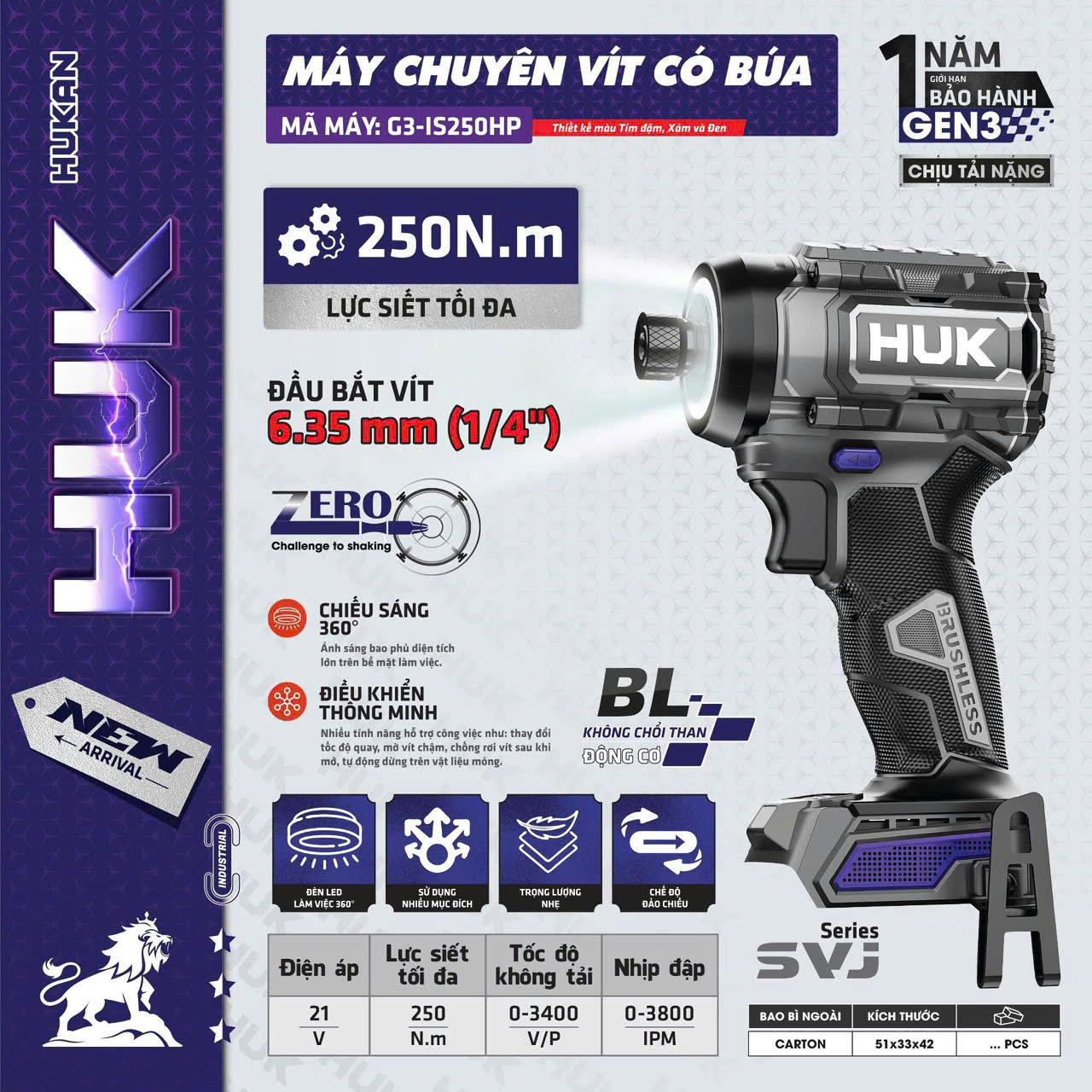 —Lực bắn mạnh mẽ 250Nm, 4 tốc độ & tính năng cho thợ chuyên nghiệp : là giải pháp lực mạnh trong thân hình gọn nhẹ dành cho thợ chuyên nghiệp và đội thi công. Sử dụng pin 21V chuẩn M21 kết hợp động cơ Brushless không chổi than, G3-IS250HP cung cấp mô-men xoắn lên tới 250Nm cùng dải tốc độ 4 cấp giúp xử lý tốt các công việc vặn vít, siết bulong vừa và nặng trong lắp dựng, cơ khí nhẹ và nội thất. Đầu gài 1/4" (6.35mm) tương thích phổ biến với hầu hết bit vít, cho phép thay đổi nhanh, tiện lợi. Máy có nhịp tác động mạnh (impact) giúp siết nhanh, tiết kiệm thời gian, đồng thời trang bị các chế độ an toàn và tiện ích như dừng trên vật liệu mỏng (bảo vệ bề mặt), chức năng mồi vít gỗ, đảo chiều dễ thao tác khi tháo ốc, và tự động giảm tốc khi đến điểm siết cuối để tránh siết quá lực.