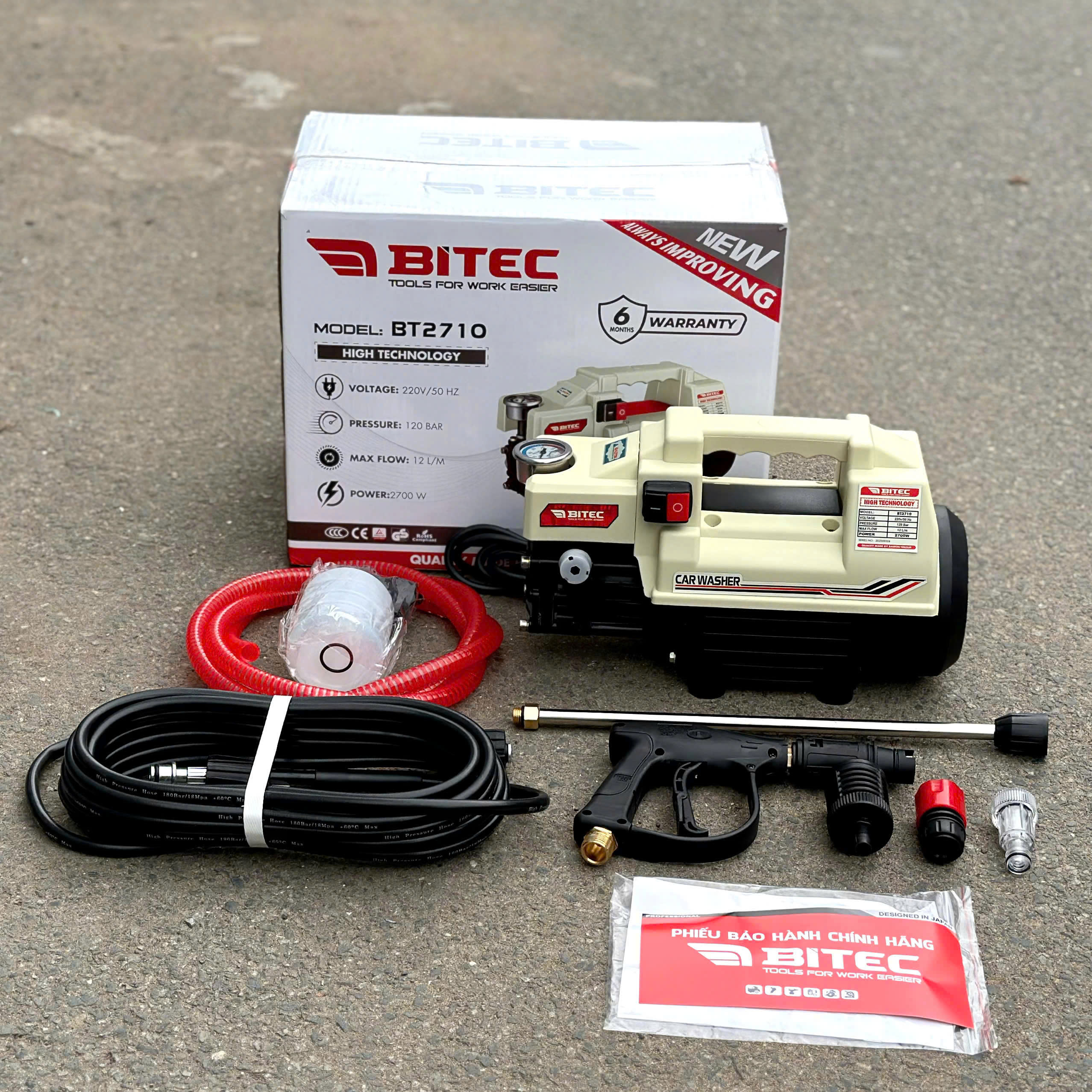 Công suất 2.700W kết hợp áp lực 120 Bar: đủ mạnh để xử lý bùn đất, vết dầu mỡ, mảng bám cứng.