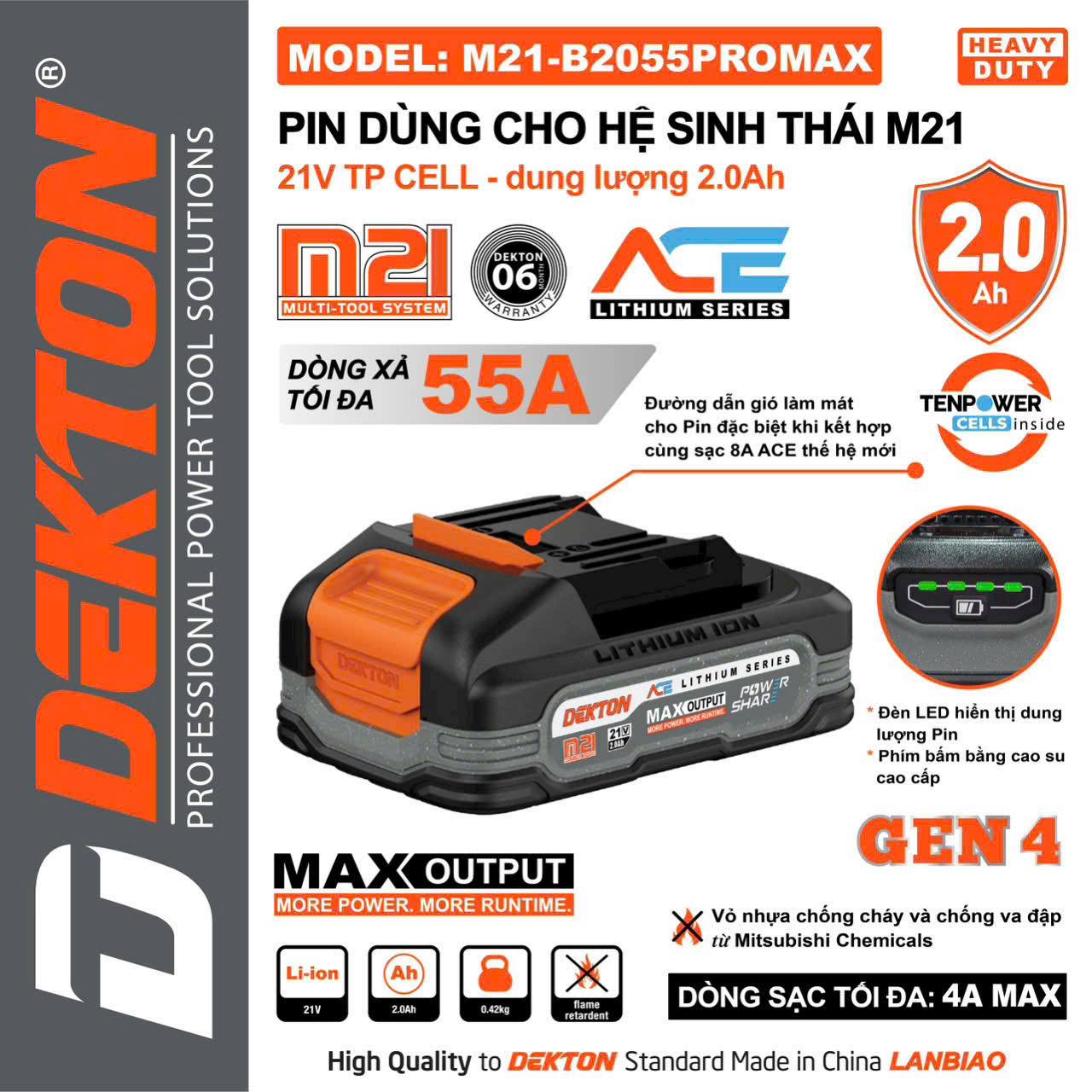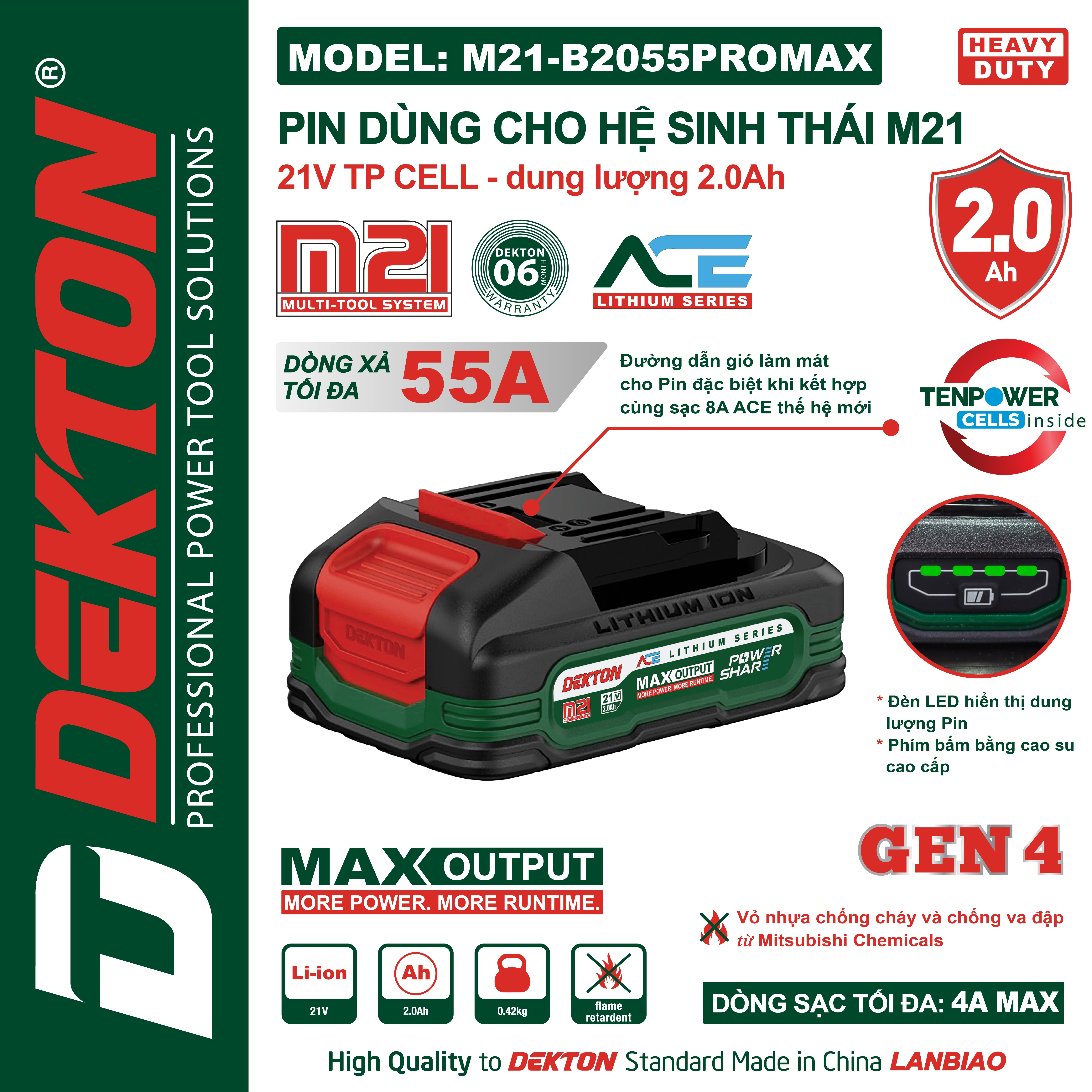 • Tương thích chuẩn chân pin M21: dễ thay thế, hoán đổi giữa các model Dekton M21.