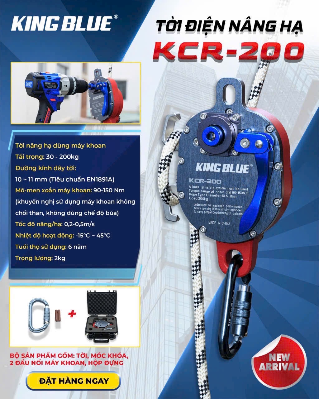Tời KINGBLUE KCR-200 là thiết bị tời gọn nhẹ thiết kế để biến máy khoan đầu kẹp thành tời nâng/hạ chuyên dụng. Với khả năng chịu tải 30–200 kg (tùy đường kính dây), tỉ số truyền 8:1, và tốc độ nâng/hạ 0,2–0,5 m/s, KCR-200 được nhiều thợ nghề, nhà thầu nhỏ và chủ vườn, chủ nhà lựa chọn vì tính cơ động, dễ lắp đặt và chi phí thấp so với tời điện cố định.