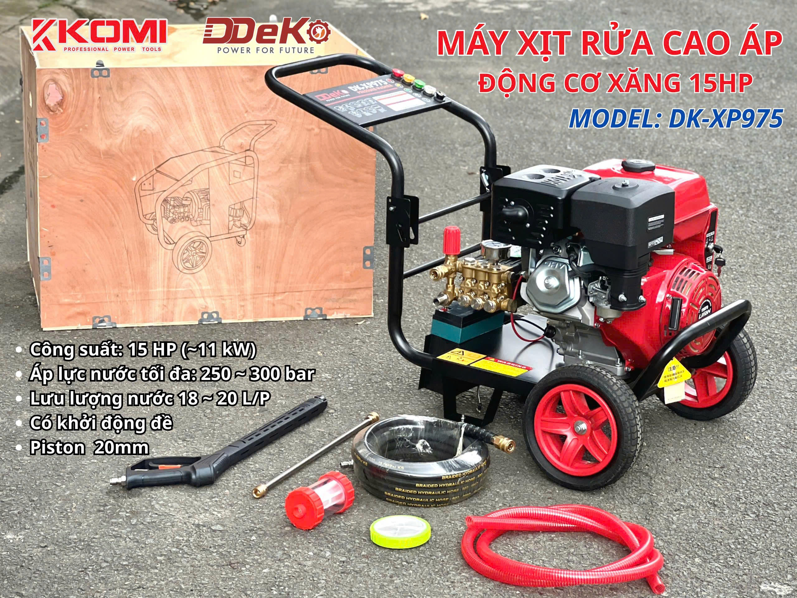 _Nếu bạn đang tìm một chiếc máy rửa công nghiệp mạnh mẽ, bền bỉ và di động để xử lý công việc rửa xe, vệ sinh bề mặt hoặc tẩy rửa công nghiệp, DDEKO DK-XP975 (15Hp, 300Bar) là lựa chọn đáng cân nhắc. Máy kết hợp áp lực cao, pittong ti sứ bền, chỉnh áp tiện lợi và phụ kiện đầy đủ — phù hợp cho cả gara chuyên nghiệp và xưởng sản xuất.