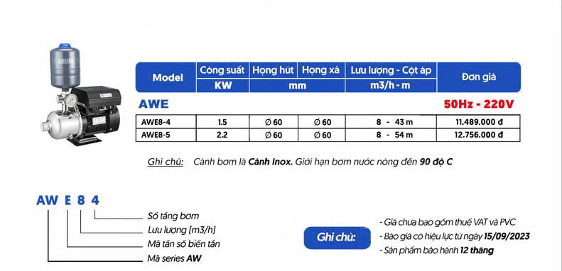 Hai phiên bản tối ưu theo cột áp: AWEB8-4 (1.5 kW ≈ 2.0 Hp, 4 tầng, cột áp 43 m) và AWEB8-5 (2.2 kW ≈ 3.0 Hp, 5 tầng, cột áp 54 m).