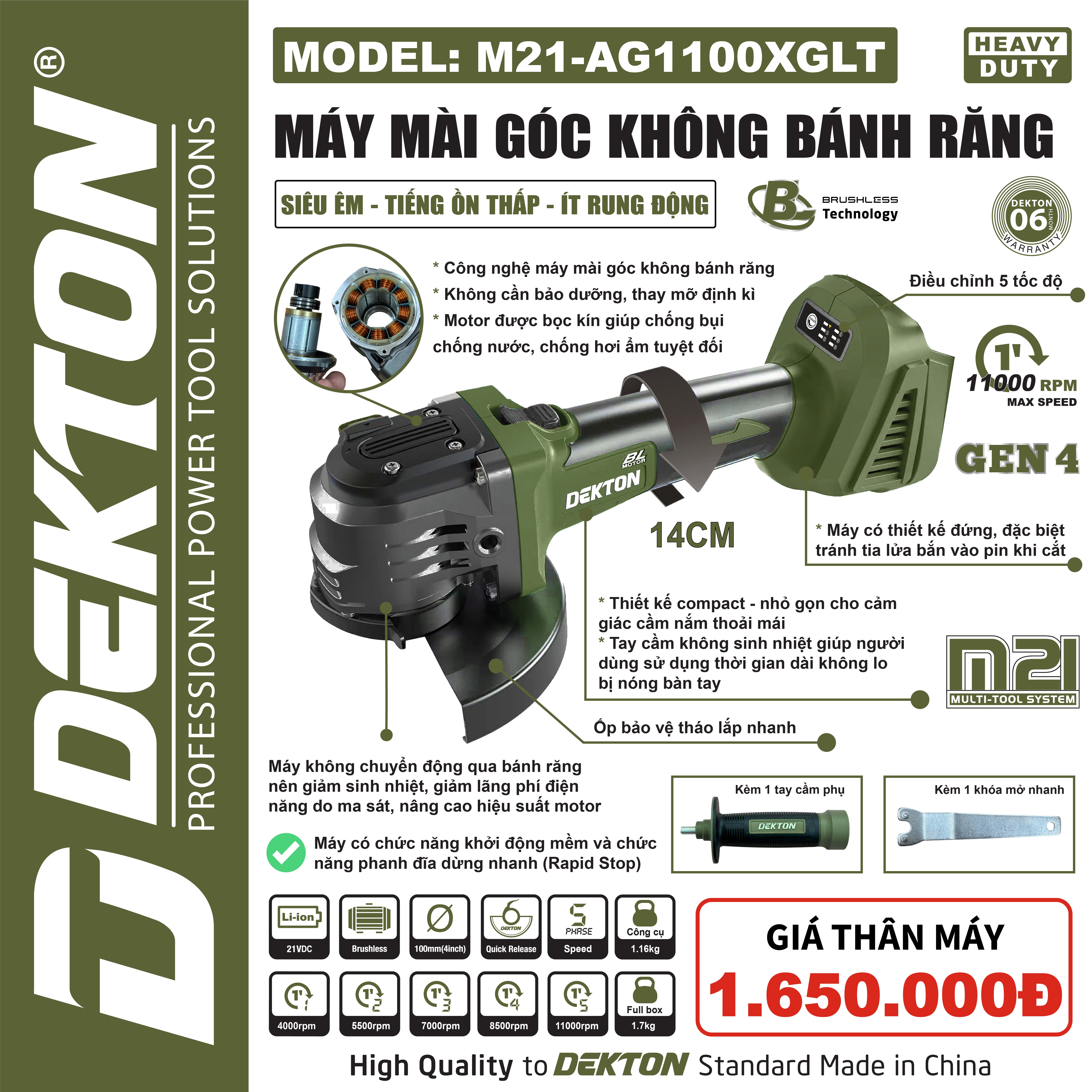 — Cấu tạo, cách hoạt động, ưu điểm & bước đột phá motor thế hệ mới : Mở đầu cho — Bước nhảy công nghệ - Công nghệ motor thế hệ mới + truyền động không bánh răng đưa máy mài góc lên một tầm mới: ít rung, tiếng ồn thấp, nhiệt sinh ra ít, hiệu suất truyền lực cao. Khi kết hợp với pin dung lượng lớn (ví dụ pin 21V — 6.0Ah dòng xả cao), máy mài đạt hiệu suất mài/cắt tối đa: nhanh hơn, sâu hơn và làm việc lâu hơn giữa các lần sạc.
