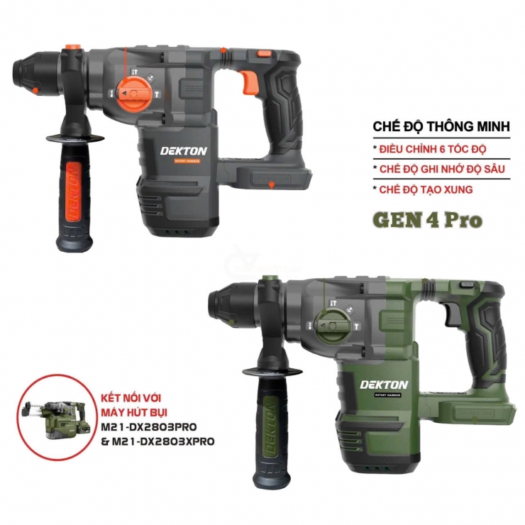 _trang bị động cơ không chổi than (brushless) giúp tăng tuổi thọ, giảm tiêu hao năng lượng và giữ mô-men xoắn tốt ở tải lớn. Nguồn điện 21V tương thích chân pin M21 phổ biến, dễ thay thế và ghép nối với hệ pin cùng hệ. Lực búa 3.2J và tần số va đập lên tới 4800 bpm cho phép khoan lỗ bê tông đến 28mm hiệu quả. Tốc độ không tải 1080 vòng/phút kết hợp chỉnh tốc 6 cấp, ghi nhớ độ sâu và chế độ tạo xung giúp tối ưu thao tác khi gặp vật liệu cứng hoặc cần kiểm soát độ sâu chính xác. Đầu gài mũi SDS-Plus 14mm tương thích rộng rãi, thuận tiện thay mũi nhanh trên công trường. Máy còn có khả năng kết nối với bộ hút bụi chuyên dụng Dekton M21-DX2803PRO, rất hữu ích khi làm việc trong không gian cần giảm bụi.