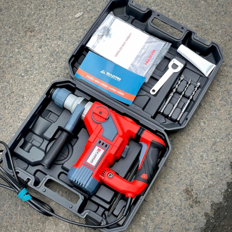 Máy sở hữu ba chức năng khoan — khoan thường, khoan búa (động lực) và đục — giúp linh hoạt chuyển đổi giữa các nhiệm vụ: khoan tắc kê, khoan lắp điều hòa, đục phá điểm hư hỏng nhỏ hoặc khoan mở lỗ phục vụ lắp đặt. Hệ kẹp mũi SDS 14mm thông dụng đảm bảo cố định mũi chắc chắn, tháo lắp nhanh chóng và tương thích với nhiều mũi khoan SDS phổ biến. Sản phẩm đóng gói trong thùng nhựa bền, kèm 3 mũi khoan (6 / 8 / 10 mm), khóa, mỡ bò và phụ kiện cơ bản; chế độ bảo hành 6 tháng bảo đảm quyền lợi sau mua.