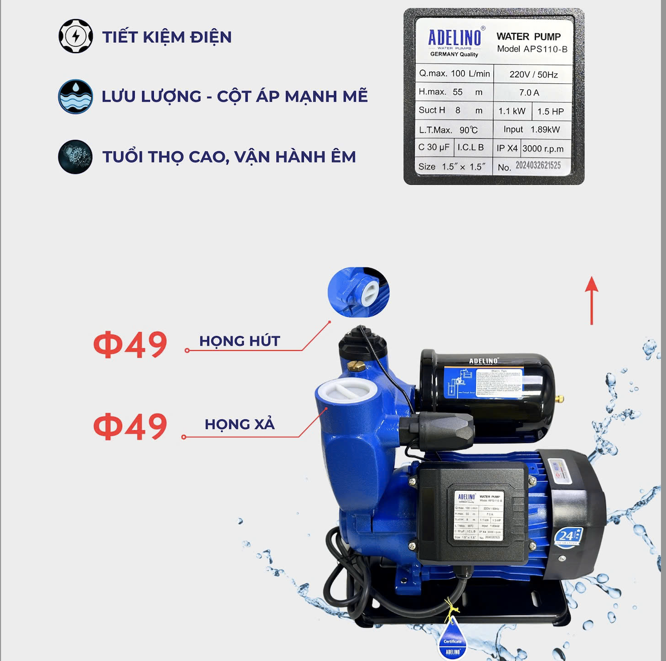 _là máy bơm tăng áp điện tử/biến tần công suất 1.1Kw (~1.5Hp) thiết kế cho ứng dụng dân dụng và thương mại nhẹ có nhu cầu lớn về lưu lượng và cột áp. Với lưu lượng 6.0 m³/h (tương đương 100 L/phút) và cột áp tối đa 55 m, cùng khả năng bơm nước nóng đến 90°C và kết nối ống lớn Φ49/49mm, APS110-B phù hợp cho nhà cao tầng, hệ cấp nước thương mại, tòa nhà nhỏ và hệ thống kết hợp bình nóng lạnh lớn. Sản phẩm sử dụng động cơ 100% dây đồng, đạt chuẩn IP55, nhập khẩu Germany Quality và bảo hành 12 tháng.