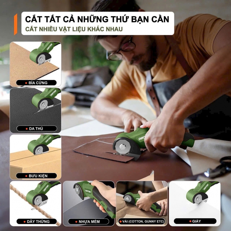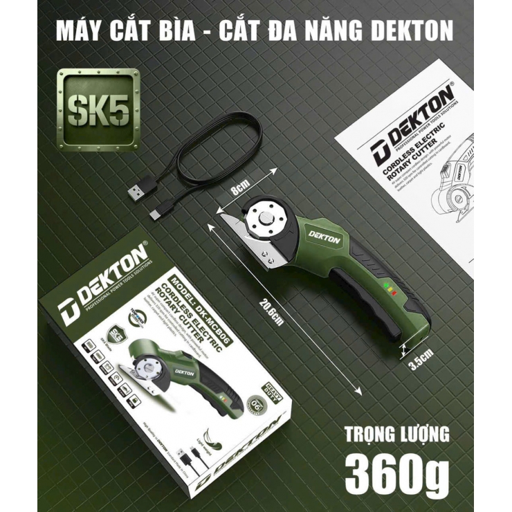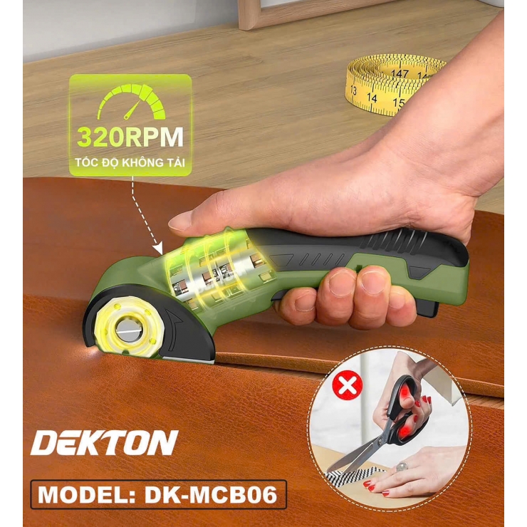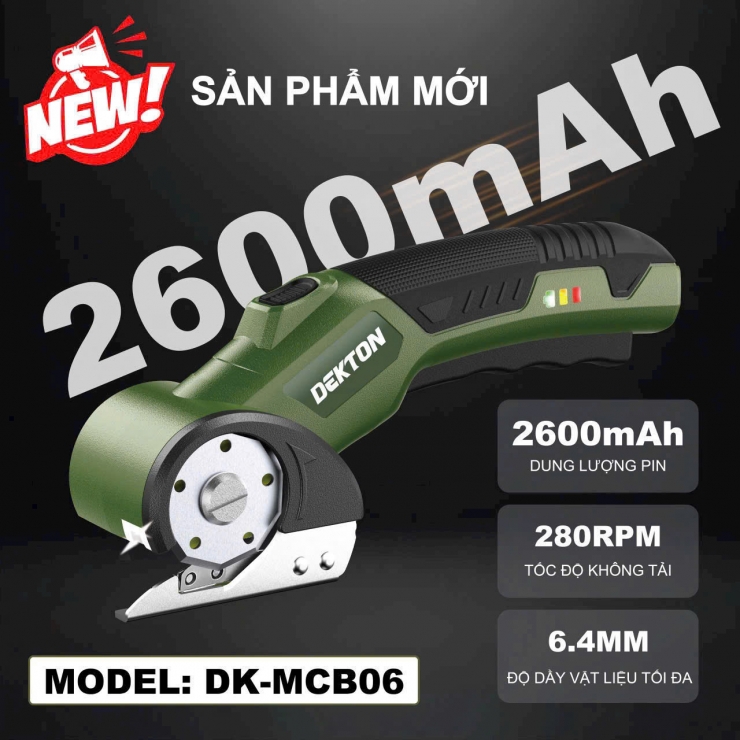 Dekton DK-MCB06 — máy cắt đa năng pin nhỏ gọn, pin 2600mAh, lưỡi SK5 sắc bén, sạc Type-C, LED & báo pin. Hoàn hảo cho cắt vải, da, carton, nhựa — bảo hành 6 tháng