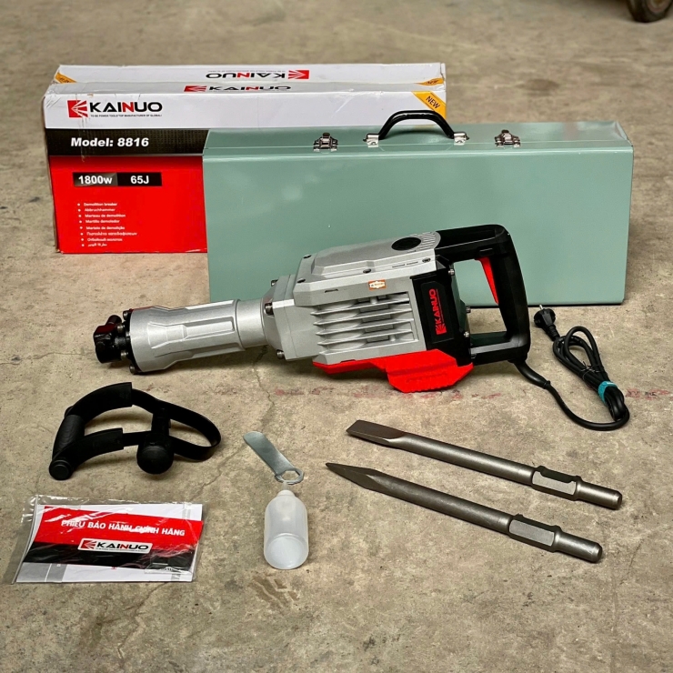 Kainuo 8816 là lựa chọn hợp lý cho đơn vị thi công và thợ chuyên nghiệp cần một thiết bị đục phá mạnh mẽ, bền bỉ và có phụ kiện đi kèm. Thông số 1800W — 65J, mũi 30mm, vỏ kim loại và hộp sắt bảo quản tạo nên tổ hợp thiết bị vừa mạnh vừa bền, giúp tăng năng suất thi công và giảm chi phí lao động.