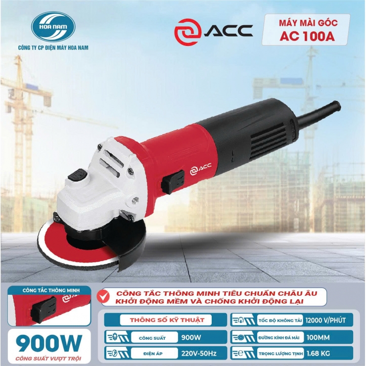 — lựa chọn hiệu năng cao cho thợ & xưởng : là dòng máy điện công suất ≈ 900W, chuyên dùng để cắt, mài và chuốt chi tiết kim loại, loại bỏ gỉ hoặc xử lý bavia trong các xưởng cơ khí nhỏ, các công trình hay nhu cầu sửa chữa cá nhân. Sản phẩm thuộc thương hiệu ACC (một thương hiệu dụng cụ điện cầm tay phổ biến trong phân khúc bình dân) — model AC100A từng được nhiều cửa hàng dụng cụ liệt vào danh mục máy mài góc ACC 900W.