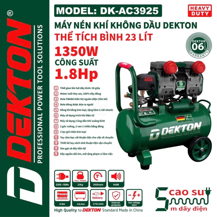 Bạn cần một máy nén khí khí sạch, nạp nhanh và gọn gàng cho gara, xưởng nhỏ hoặc công việc sơn? DEKTON DK-AC3925 (23L) là lựa chọn phù hợp. Liên hệ đại lý DEKTON chính hãng để được tư vấn phù hợp công suất, giá, giao hàng và hỗ trợ bảo hành 6 tháng.