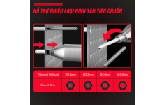 —Động cơ hiệu suất cao Brushless, 21V M21 chân Pin thông dụng dễ dàng ghép nối , rút đinh rive tự nhả, kèm 4 đầu rút : là thiết bị cầm tay chuyên nghiệp cho công tác lắp ghép kim loại, vỏ máy, khung, tấm chắn và các ứng dụng cơ khí yêu cầu mối nối rivet nhanh, chắc và ổn định. Máy dùng pin 21V chuẩn chân M21, trang bị động cơ không chổi than (Brushless) cho hiệu suất cao và tuổi thọ motor dài hơn, khả năng rút rivet từ Φ 2.4 mm tới 6.0 mm, lực rút (pull force) đạt 10.000Nm, hành trình rút tối đa 20 mm, cơ chế bấm 1 lần — tự nhả đinh giúp thao tác nhanh, năng suất cao. Bộ tiêu chuẩn đi kèm gồm hộp nhựa bảo quản, thân máy, khóa và 4 đầu rút tương ứng cỡ đinh 2.4 / 3.2 / 4.0 / 4.8 mm — phù hợp hầu hết nhu cầu công trình và xưởng.