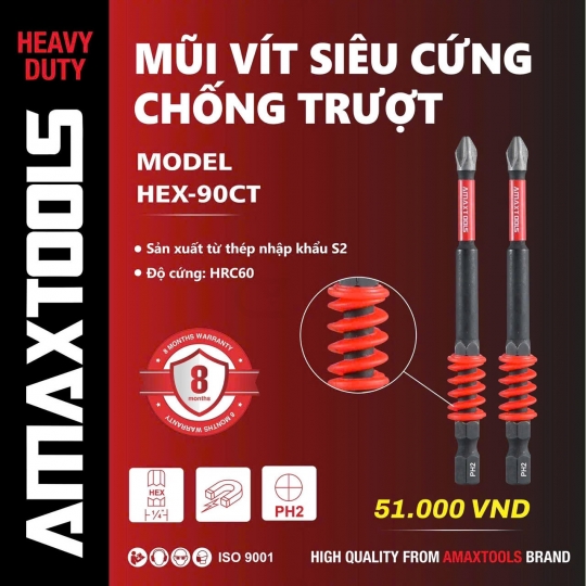 Chống trượt hiệu quả: hạn chế trượt (cam-out), bảo vệ đầu ốc và tăng hiệu suất vặn.