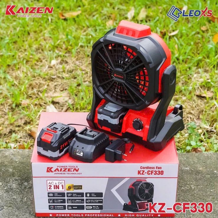 ( kèm 1 pin 10cell + sạc ) : là giải pháp quạt đa năng dùng cho công trường, nhà xưởng, gara, sân vườn, camping và sinh hoạt gia đình khi cần quạt di động, chạy cả bằng pin 21V (chân pin thông dụng) lẫn nguồn điện 220V thông qua adapter 21V DC. Với công suất 35W, dải tốc độ 0–3000 vòng/phút, 3 cấp chỉnh tốc, lưu lượng gió khoảng 14.5 m³/phútgóc quay tối đa 225°, KZ-CF330 cân bằng giữa hiệu suất làm mát, tính di động và thời gian hoạt động. Sản phẩm tích hợp cổng sạc USBđèn chiếu sáng, đi kèm adapter 220V/21V, pin 10-cell, móc treo và sạc pin — phù hợp ứng dụng thi công, sửa chữa, dịch vụ sự kiện và sử dụng gia đình. Bảo hành 6 tháng.